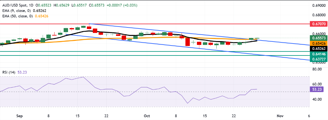 周二,澳元/美元在 0.6560 左右交易。技术分析表明,由于该货币对略高于下降通道的上边界,日线图上出现了看涨反转。该货币对也高于九日和50日指数移动平均线(EMAs),表明短期和中期的价格动量仍然强劲。