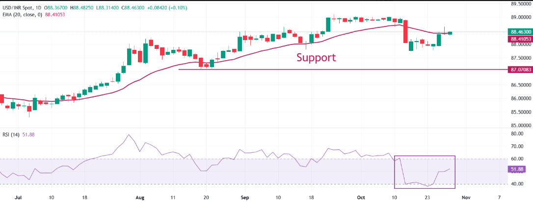 周三开盘时,美元/印度卢比升至接近88.50。该货币对努力重返20日指数移动平均线(EMA)上方,目前该平均线约为88.41。