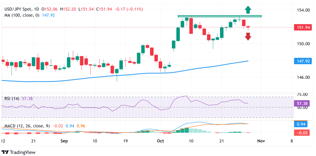 本周在153.25-153.30这一障碍附近(月度摆动高点)的失败,构成了日线图上的看跌双重顶形态,并支持美元兑日元进一步贬值的论点。也就是说,上述图表中的指标仍然保持在正区域,表明任何进一步的下跌可能会在151.10-151.00区域找到一些支撑。然而,如果后者被有效突破,通往150.00心理位置的更深层次的损失之路将被打开,并在150.45区域附近有一些中期支撑。
