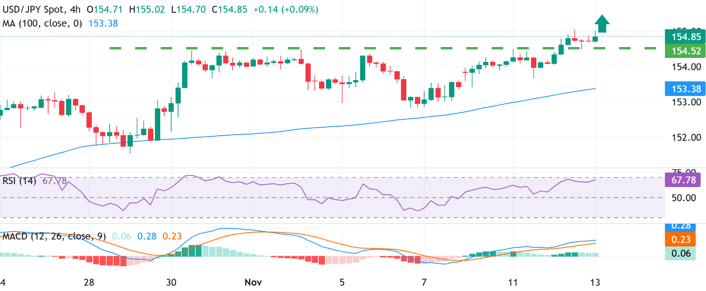日元(JPY)前一天兑美元触及九个月低点后,仍然徘徊在九个月低点附近,日本银行(BoJ)行长植田直通关于核心通胀正在逐步加速向2%目标迈进的言论之后,日元表现疲软。围绕日本银行(BoJ)加息计划的不确定性,以及日本首相高市圣子支持刺激措施的立场和她希望利率保持在低水平的偏好,继续削弱日元。此外,由积极的重新开放美国联邦政府的进展所带来的乐观情绪,成为另一个削弱日元避险地位的因素。