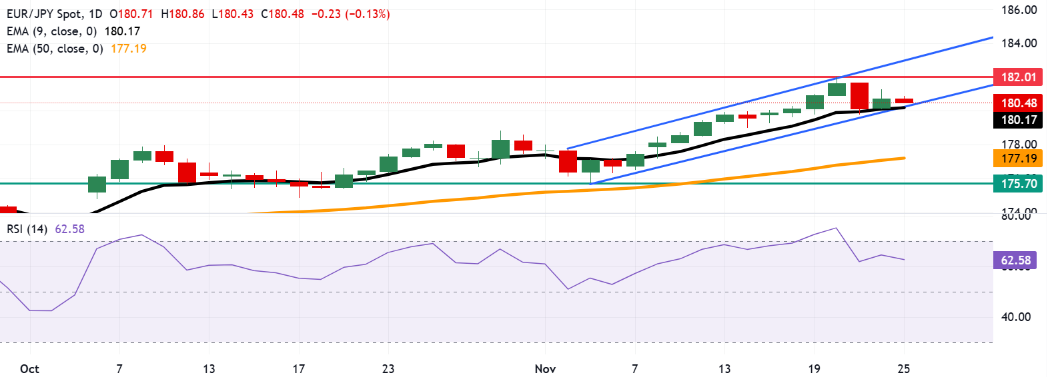 在上一交易日录得超过0.25%的跌幅后,EUR/JPY在周二的欧洲早盘时段交易于180.50附近。该货币交叉在上升通道内向上移动,表明存在持续的看涨偏见。