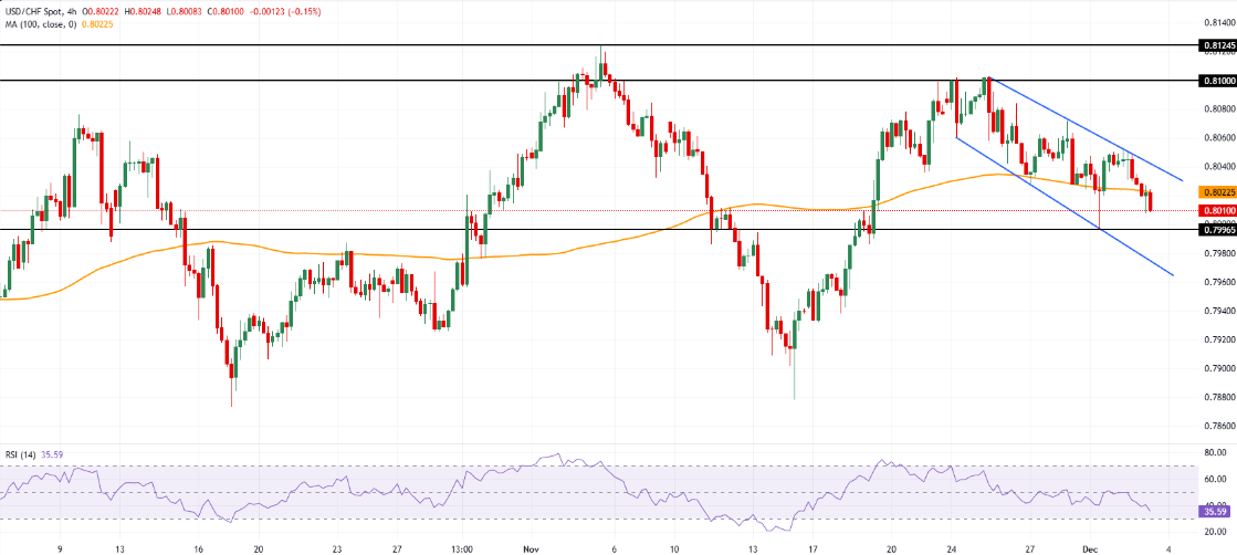 美元/瑞士法郎周三在0.8000上方企稳,写作时交易在0.8010附近,日内下跌0.25%。该货币对继续跟随美元走弱的 broader 趋势,由于政治不确定性以及更强的美联储(联邦储备)实施货币宽松的预期,美元指数(DXY)下跌至99.10,日内下跌0.15%。