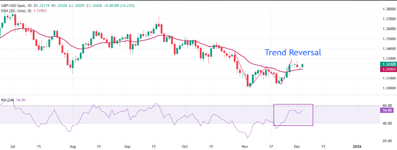 英镑兑美元周三跳升至接近1.3250。英镑兑美元对20日指数移动平均线(EMA)保持在1.3192上方,显示出近期的积极趋势。