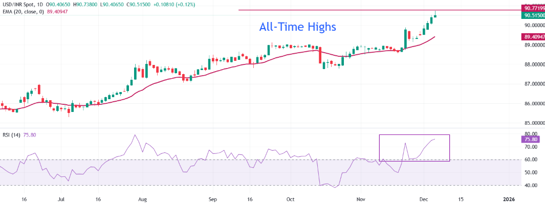 美元/印度卢比在周四的盘中交易中约为90.70。20日指数移动平均线(EMA)在89.40附近持续上升,价格保持在其上方,强化了短期看涨的走势。