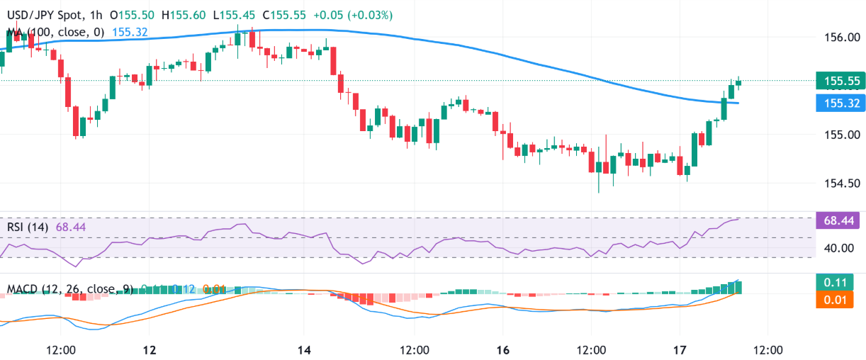 美元/日元可能瞄准156.00;日内突破100小时移动平均线将发挥作用