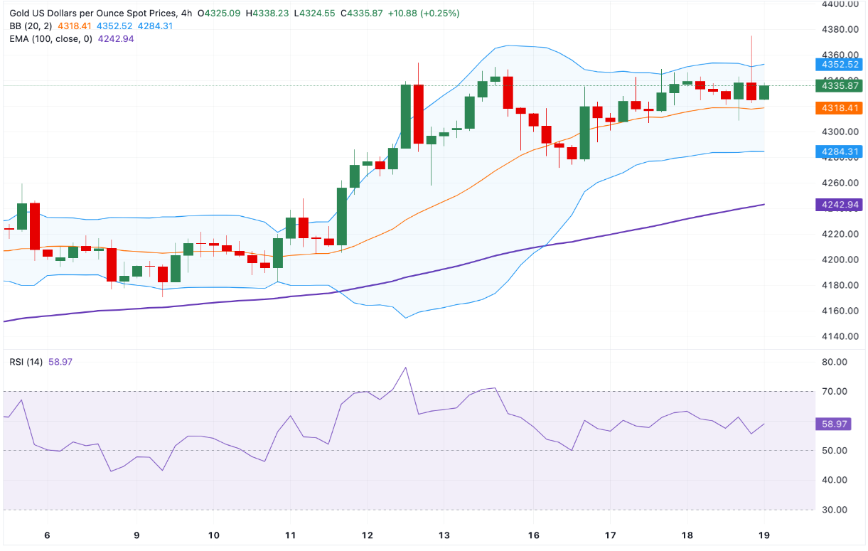 XAU/USD的第一个上行障碍出现在布林带的上边界4,352美元。如果突破这个水平,买家可能会介入并推动价格重新上涨至历史新高4,381美元,并有望迈向4,400美元的心理关卡。