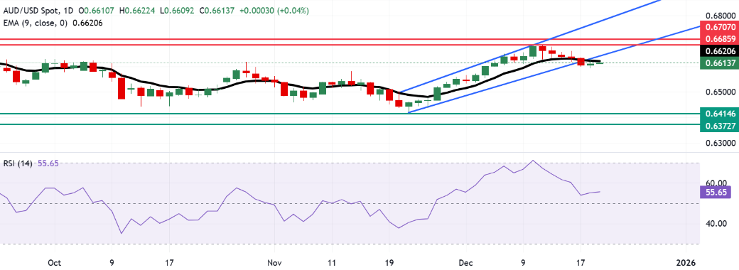 澳元兑美元周五交易价低于0.6620。日线图的技术分析显示,该货币对处于上升通道趋势线下方,反映出看涨偏好的减弱。九日指数移动平均线(EMA)呈上升趋势,位于当前价格附近,限制了进一步上涨的尝试。在过去两周内,短期平均线持续上升,表明看涨偏好的改善。