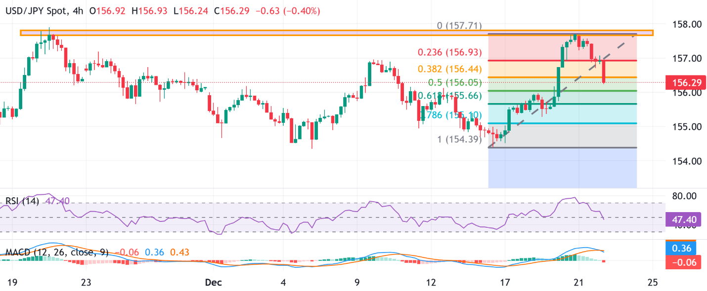 移动平均线收敛背离(MACD)线滑落到信号线下方,两者都围绕零轴波动,柱状图转为负面,表明看涨动力减弱。RSI在从超买状态撤退后位于47.40(中性)。从154.39的低点到157.71的高点,50%的回撤位在156.05,提供附近支撑。如果保持在后者之上,可能会将调整限制在内。
