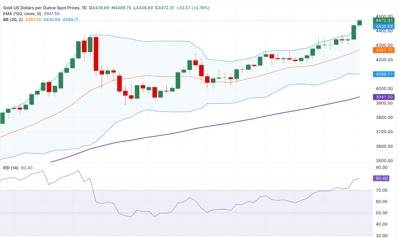 周二欧洲交易时段初,黄金价格(XAU/USD)创下历史新高。在过去的一个月里,这种贵金属上涨了10%,在2025年几乎上涨了70%,因为地缘政治紧张局势加剧和经济不确定性增加推动了对黄金等避险资产的需求。
