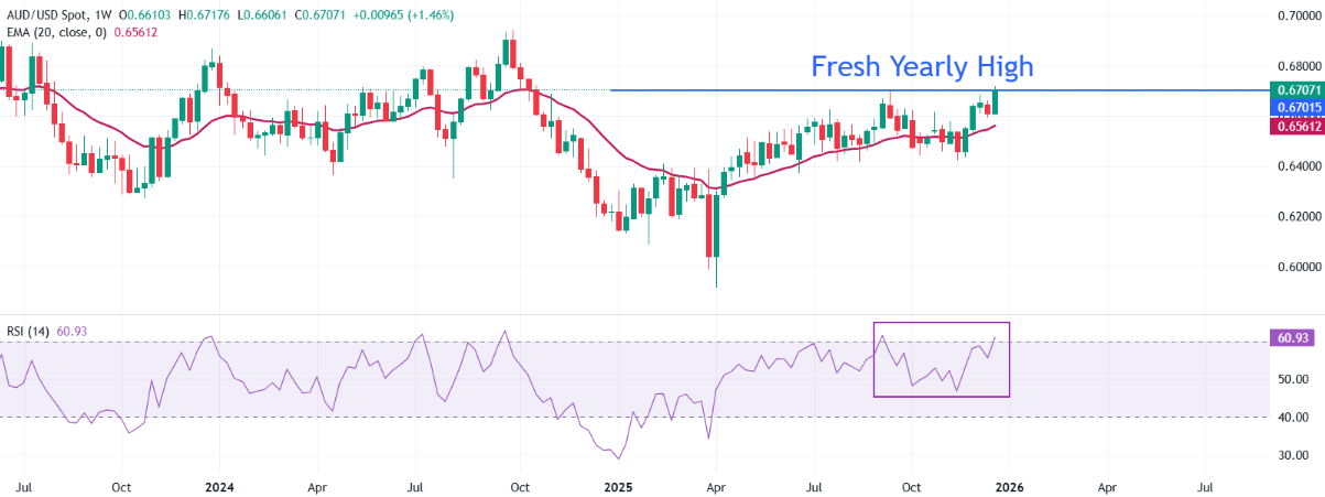 趋势条件依然强劲,因为20周指数移动平均线(EMA)继续呈上升趋势,支撑位集中在0.6561-0.6546的EMA带上。RSI尚未达到超买水平,留下了在70之前进一步延伸的空间。周线收盘价高于0.6700这一整数水平将为看向10月7日高点0.6810的进一步上涨打开大门。