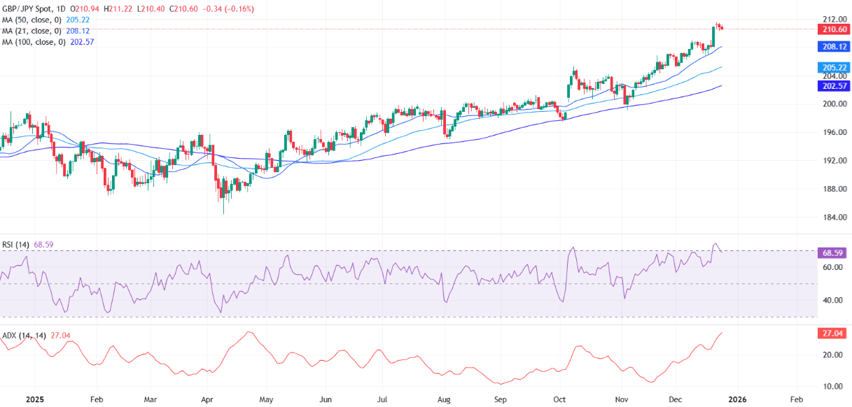 尽管如此,相对强弱指数(RSI)正在从超买区域缓解,并徘徊在68左右,这表明在下一段上涨之前可能会有温和的调整或整理。如果持续复苏,该货币对可能会突破212.00水平,延续更广泛的看涨趋势。