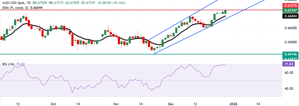 周一,澳元兑美元徘徊在0.6720附近。日线图的技术分析显示,该货币对在上升通道内向上移动,表明有持续的看涨倾向。该货币对保持在上升的九日指数移动平均线(EMA)之上,维持了短期的上涨趋势。平均继续上升,保持了看涨倾向。14日相对强弱指数(RSI)为70.24(超买),表明有强劲的动量但也有过度延伸的迹象。
