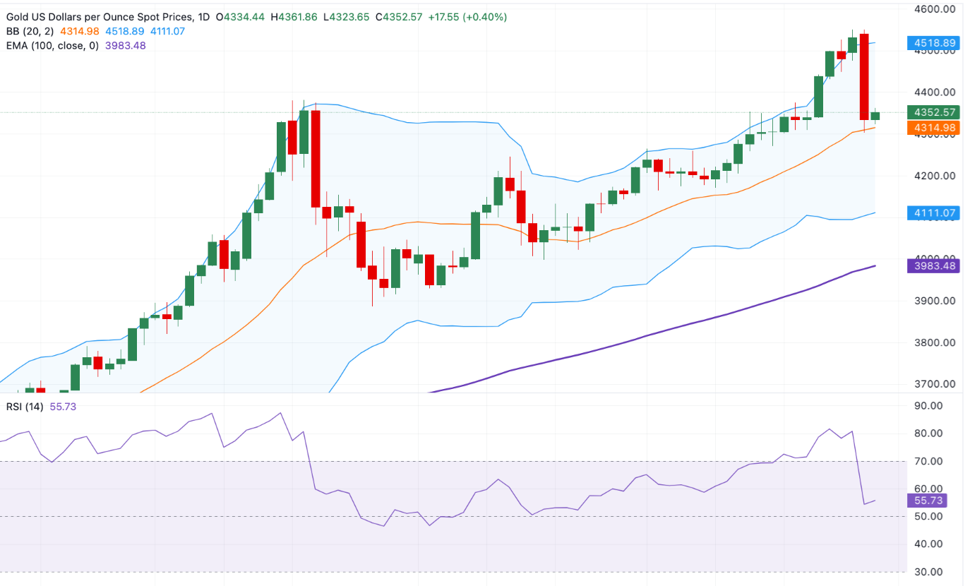 黄金 价格(XAU/USD)在周二的欧洲早盘时段高于4350美元。这种贵金属在上一交易日下跌4.5%后,收复了一些失地,这是自10月以来黄金的最大单日损失。芝加哥商品交易所集团(CME Group)提高了黄金和白银 期货的保证金要求,这是一些最大的商品交易大厅之一,促使广泛的获利回吐和投资组合再平衡。
