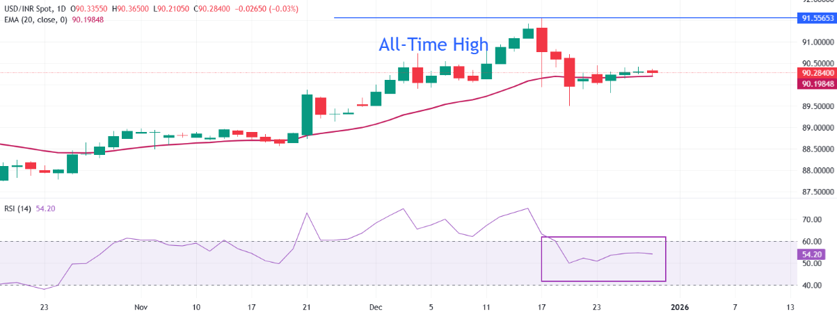 美元/印度卢比在周二的开盘交易中围绕90.30窄幅波动。20日指数移动平均线(EMA)在90.20附近上升,价格保持在上方,维持温和的看涨 bias。20日 EMA 已经在多个交易日内逐步上升,表明需求稳定。