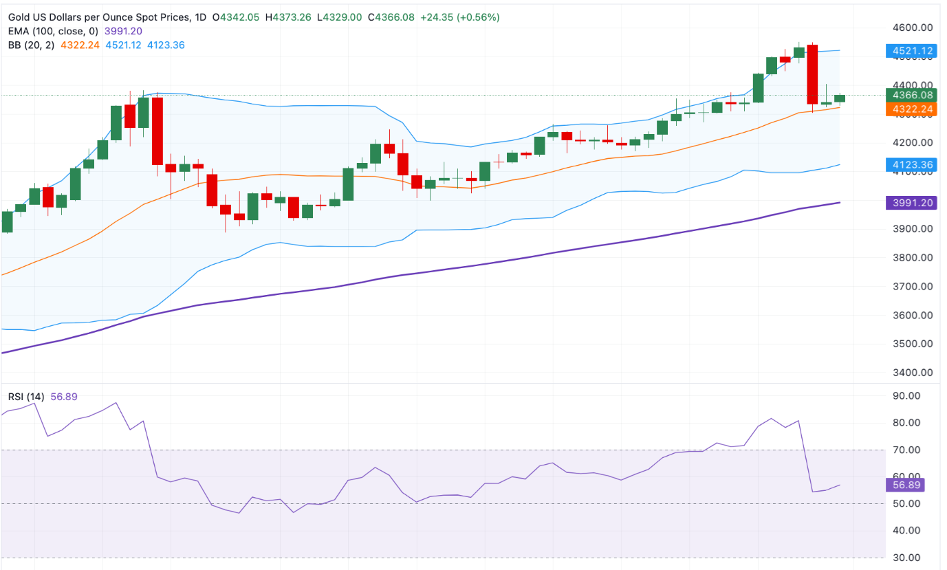 黄金/美元的第一个上行障碍位于布林带上轨的4,520美元。绿色蜡烛和在这一水平上方的稳定行动可能会将价格推高至历史新高4,550美元,并朝着4,600美元的心理关卡迈进。