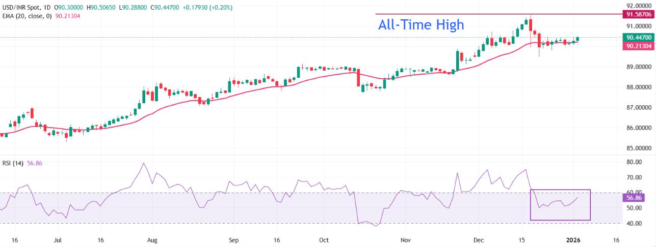 在日线图上,美元/印度卢比交易于90.4470。20日指数移动平均线(EMA)斜率为90.2130,保持温和的看涨趋势。价格保持在指标之上,表明仍有逢低买入的需求。