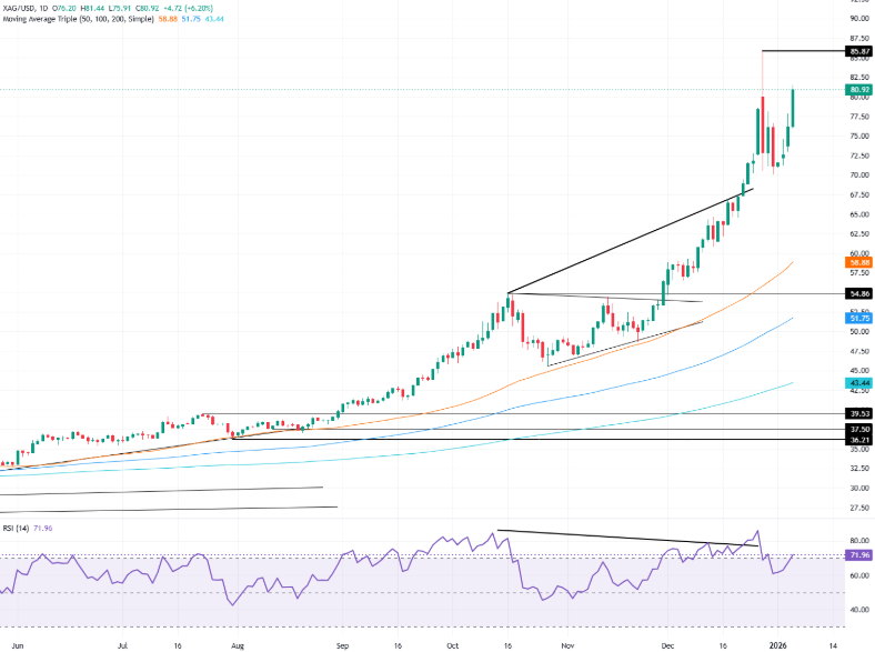银价(XAG/USD)继续呈抛物线式上涨,周二上涨超过5%,尽管美国国债收益率上升和美元走强,但每盎司交易价格仍高于80.00美元。