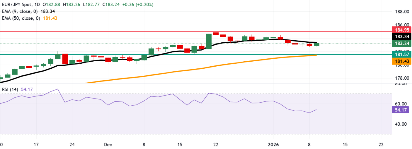 欧元/日元在亚洲时段周五交易于183.20附近,已从上一交易日的损失中恢复。日线图的技术分析表明,14天相对强弱指数(RSI)在54(中性)显示在从超买状态缓解后,有稳定的动力。RSI接近50-55区间,支持市场稳定,但未发出进一步上涨的信号。
