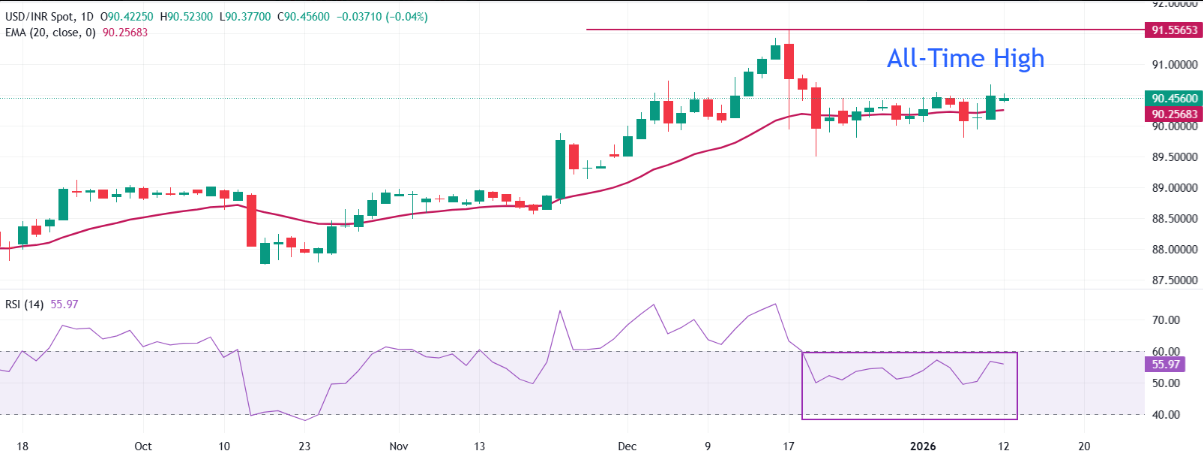 在日线图上,美元/印度卢比交易于90.4665。价格保持在上升的20日指数移动平均线(20-EMA)90.2578上方,使短期趋势偏向上行,因为平均值逐步上升。RSI处于56(中性),反映出稳定的势头,没有超买压力,允许在平均值上方继续上涨。