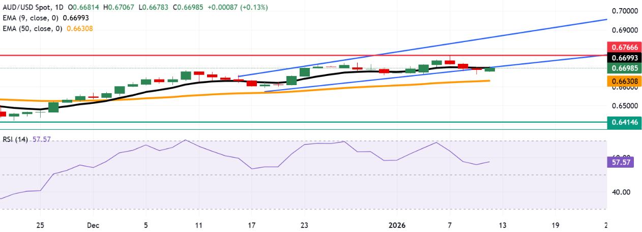 周一,澳元兑美元在0.6700附近交易。日线图分析显示,该货币对尝试反弹至上升通道,表明新的看涨趋势。14日相对强弱指数(RSI)为58.33,仍高于中点,支持上涨动力。