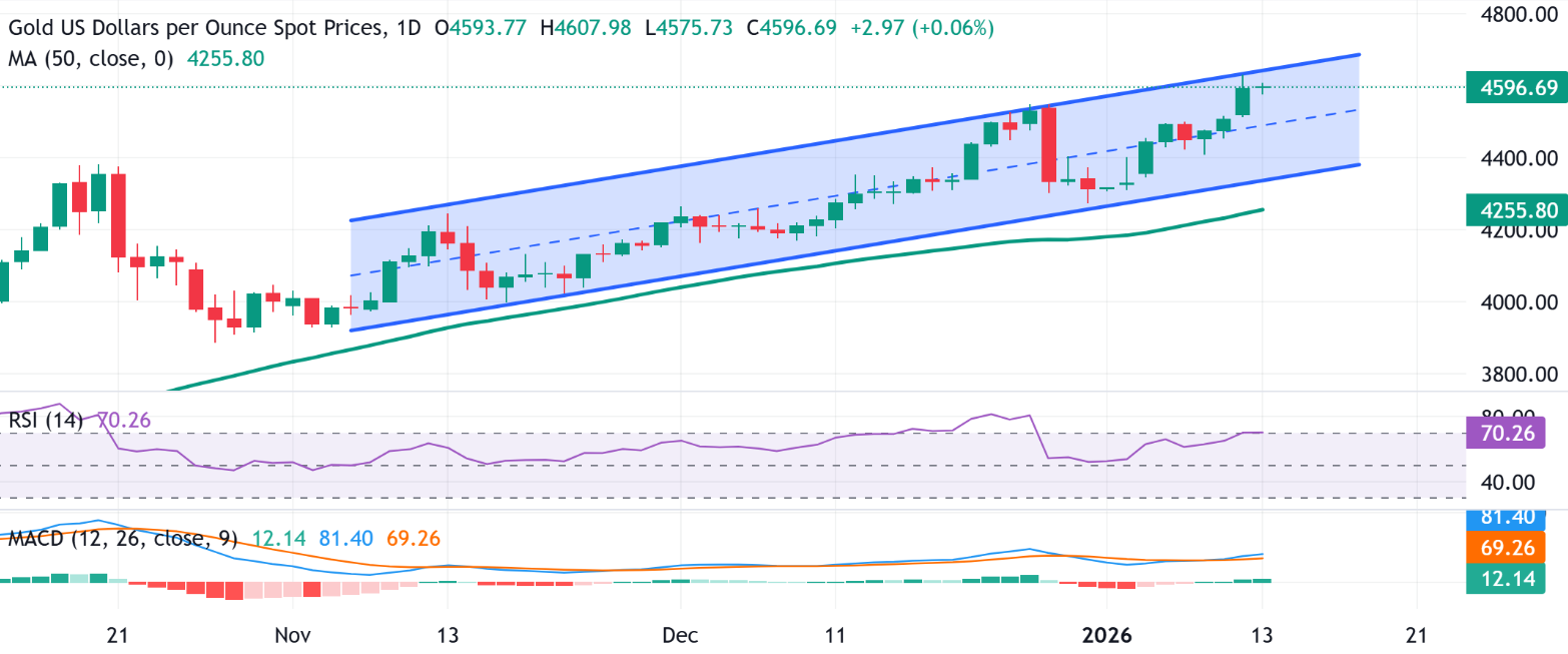 从$3,920.24到$4,656.02的上升通道指引了上涨趋势,阻力位在$4,656.02附近。50天简单移动平均线(SMA)呈上升趋势,表明有强劲的买盘 bias。XAU/USD对持有在SMA之上,保持了看涨控制。移动平均线收敛发散(MACD)线位于信号线上方,且两者都处于正区域。宽幅正柱线表明动量增强,而相对强弱指数(RSI)显示为70.26(超买),这可能会限制上涨至通道天花板。