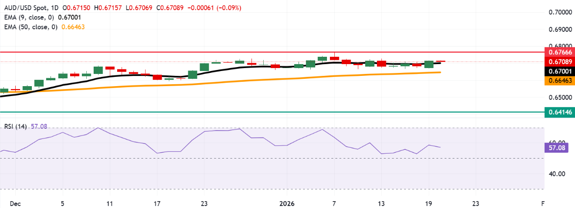 澳元保持在九日指数移动平均线之上,位于0.6700。