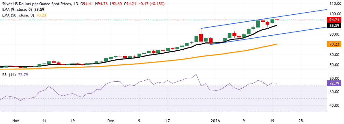 银价 (XAG/USD) 在触及新的纪录高点94.76美元后持续走低,目前在周二欧洲时段每盎司94.20美元附近交易。日线图技术分析显示,贵金属在上升通道内交易走高,表明有持续的看涨趋势。