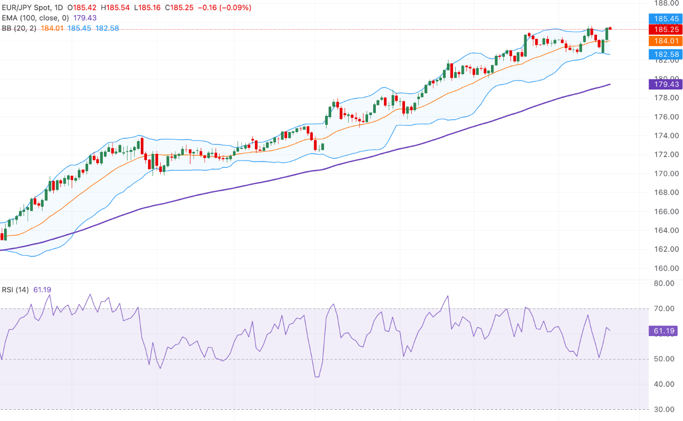 在日线图上,EUR/JPY保持在100日指数移动平均线(EMA)上方179.43,以维持强劲的上涨趋势。价格在185.45的上部布林带上施压,随着带宽的扩大,这表明强劲的势头和波动性的增加。RSI为61,虽然积极,但尚未超买,保持看涨压力。上部带限制了短期的上涨空间,而最初的支撑位位于184.00的中部带和100日EMA的179.43。