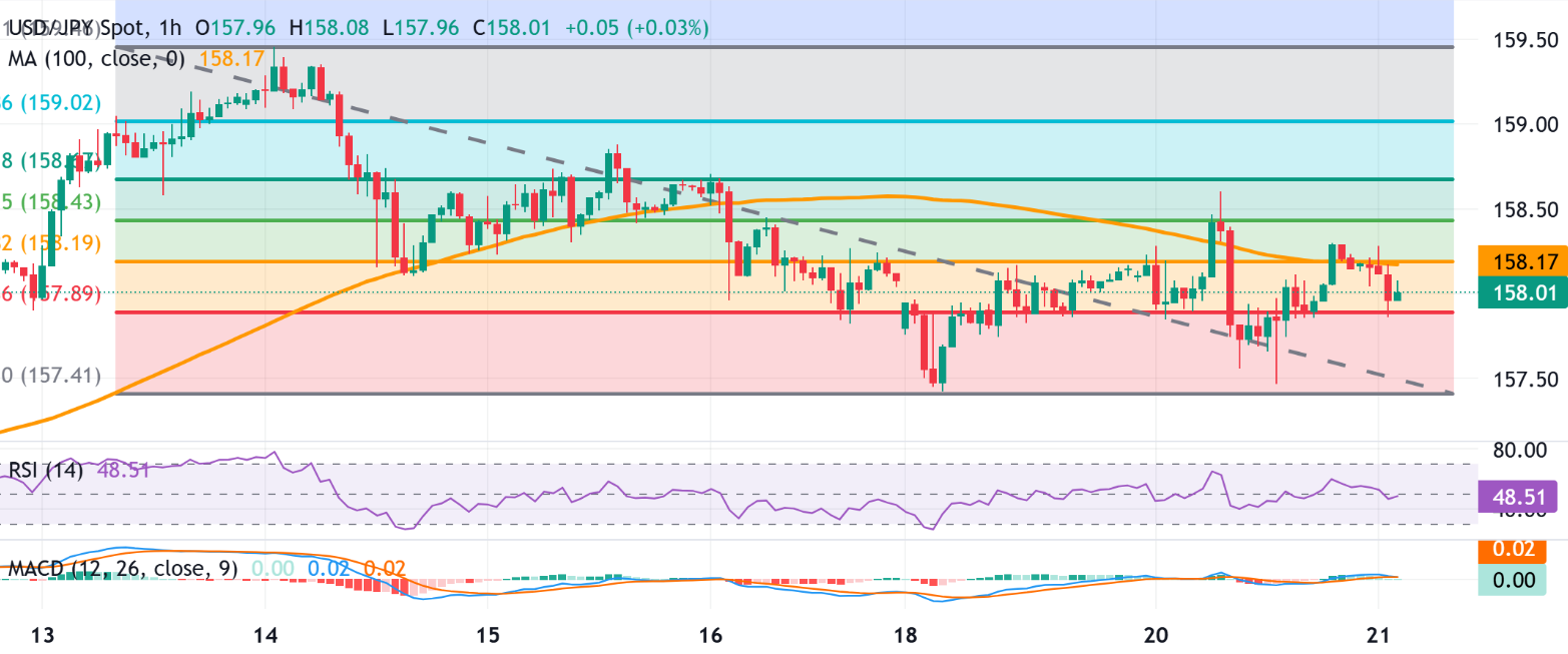 100期简单移动平均线(SMA)在158.17处呈下降趋势,美元/日元对在其中下方保持,维持看跌的日内偏好。MACD和其信号线聚集在零附近,平缓的直方图表明动量有限。相对强弱指数(RSI)位于48(中性),提供很少的方向性优势。从159.46的高点到157.41的低点测量,38.2%的斐波那契回撤位在158.19,50%的回撤位在158.43,限制了最初的反弹。