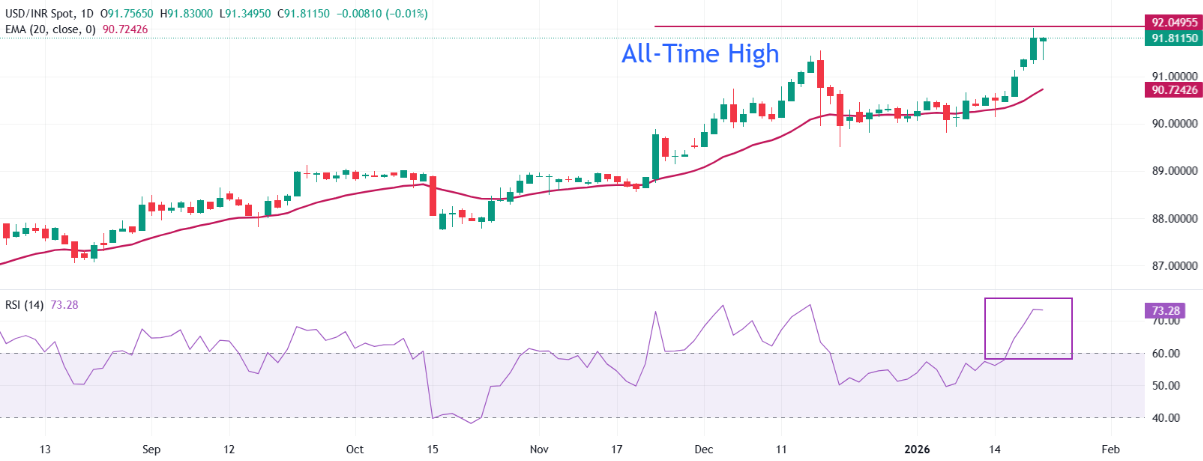 截至撰写时,USD/INR 交易坚定地接近 91.81。该货币对保持在上升的 20 日指数移动平均线 (EMA) 之上,维持了坚定的看涨偏好。20 日 EMA 继续向上倾斜,确认了趋势强度。