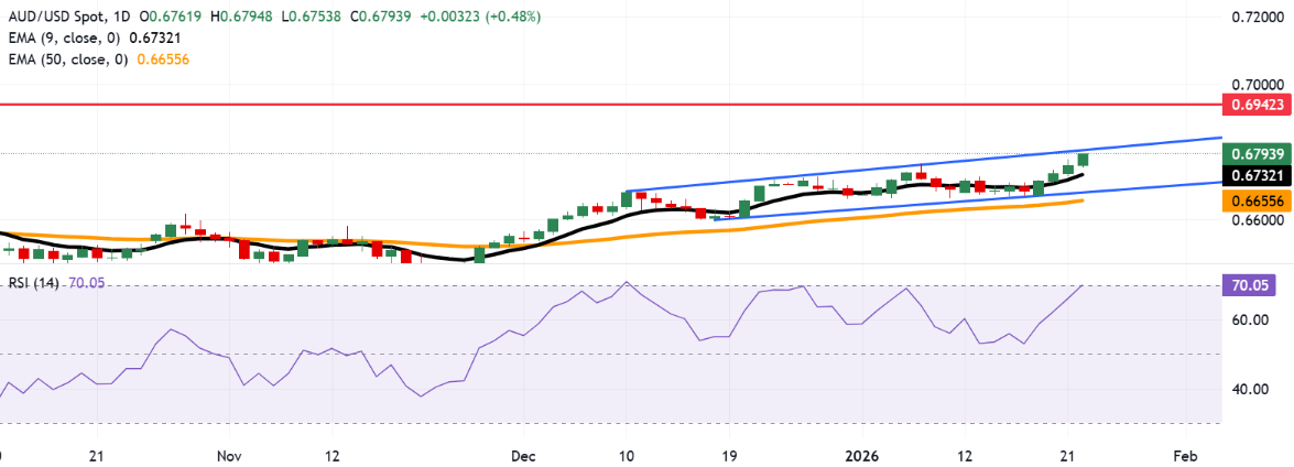 澳元/美元对在周四约为0.6790附近交易。日线图分析表明,该货币对在上升通道内上升,显示出持续的看涨偏见。此外,九日指数移动平均线(EMA)上升至50日EMA之上,现货价格高于两者,强化了看涨的氛围。这种排列保持了上涨的压力。14日相对强弱指数(RSI)为69.93,接近超买水平,表明动量已被拉伸。