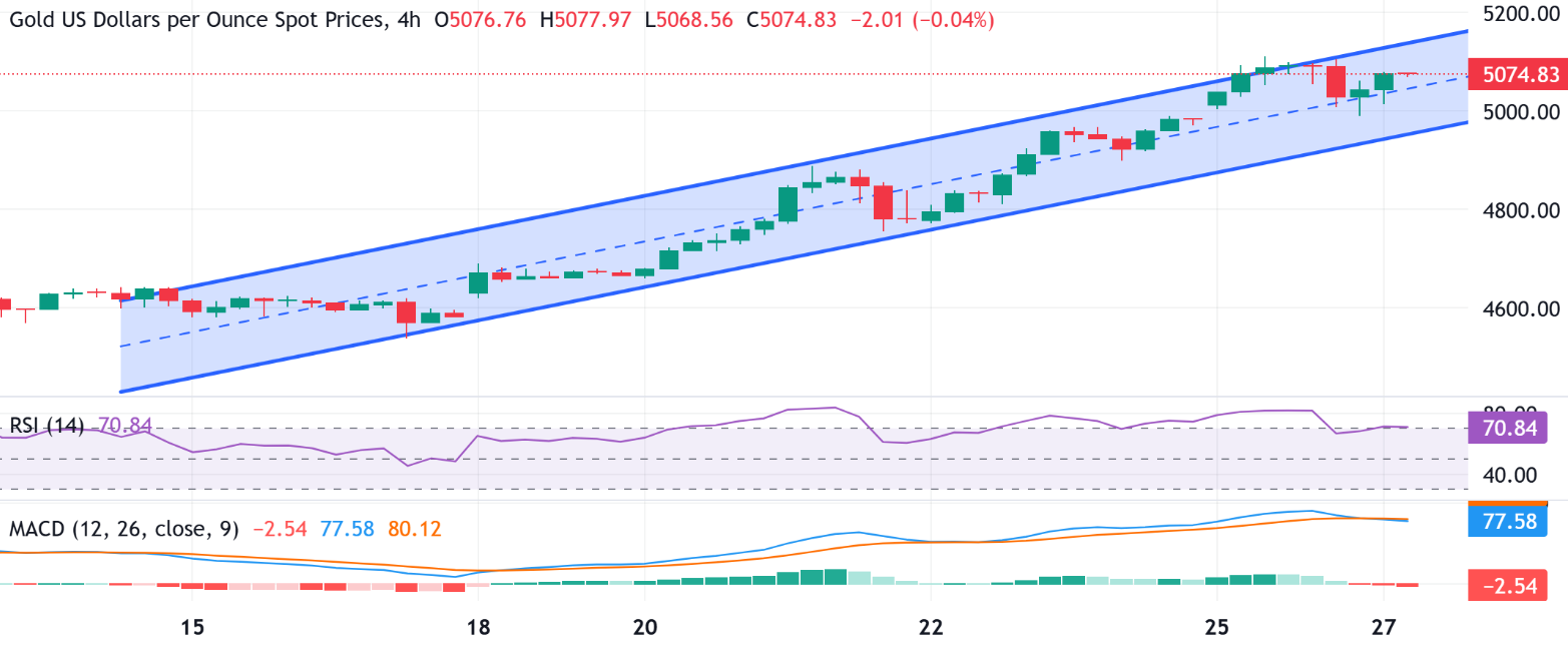 相对强弱指数(RSI)为70.84,表明超买且有所缓解,在XAU/USD对在通道内整理时,买家可能会保持谨慎。在上方,通道的上边界在$5,156.89限制了上涨。MACD的复苏需要形成看涨交叉才能重新确立上涨动力,而较高的RSI表明在持续突破之前需要消化。如果4小时收盘价突破上限,将打开延续上涨趋势的通道,而如果未能改善势头,偏向上可能会进一步测试通道下边界。