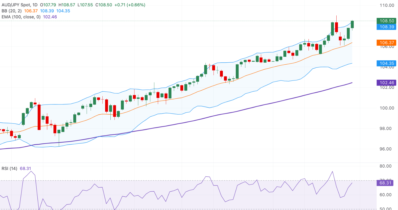 AUD/JPY在周四的欧洲早盘时段强劲上涨至约108.50。