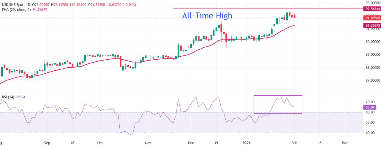 在周一的开盘时段,印度卢比(INR)对美元(USD)走强,此前印度政府在周日公布了2026-27财年预算。 美元/印度卢比货币对下跌至接近91.85,印度储备银行(RBI)在即期和非交割远期(NDF)市场上进行了干预,以在美元兑印度卢比接近历史最低点时为印度卢比提供支撑。