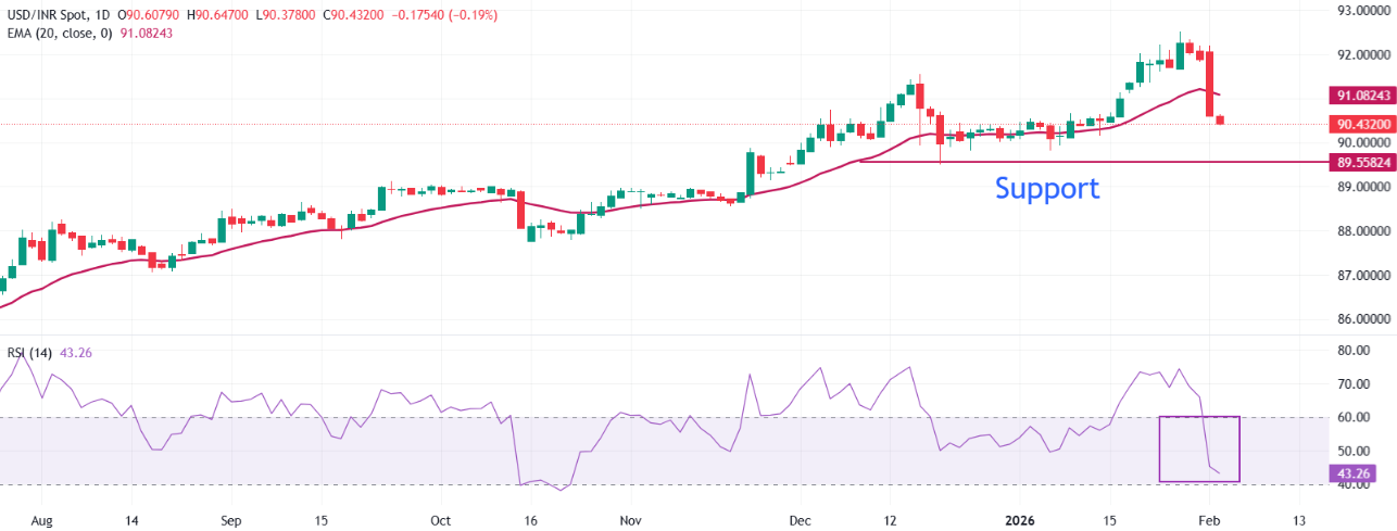 美元/印度卢比交易价格大幅下跌至近90.35。价格滑落至20日指数移动平均线(EMA)下方,目前为91.0816,短期趋势保持疲软。20日EMA已经开始反转,强化了修正的语气。上涨可能会受到EMA的限制。