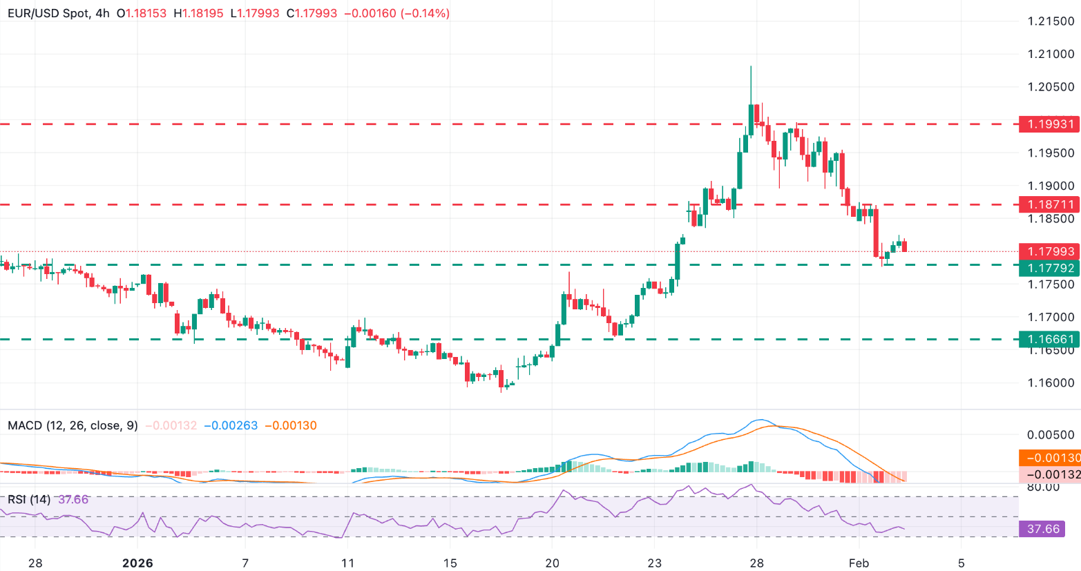 欧元/美元从低点反弹,但短期趋势仍为看跌。4小时图中的相对强弱指数(RSI)指向约40的上方,强调看跌势头正在减弱。同样地,移动平均线收敛发散(MACD)柱状图显示红色柱子在收窄,这表明卖压有所缓解。