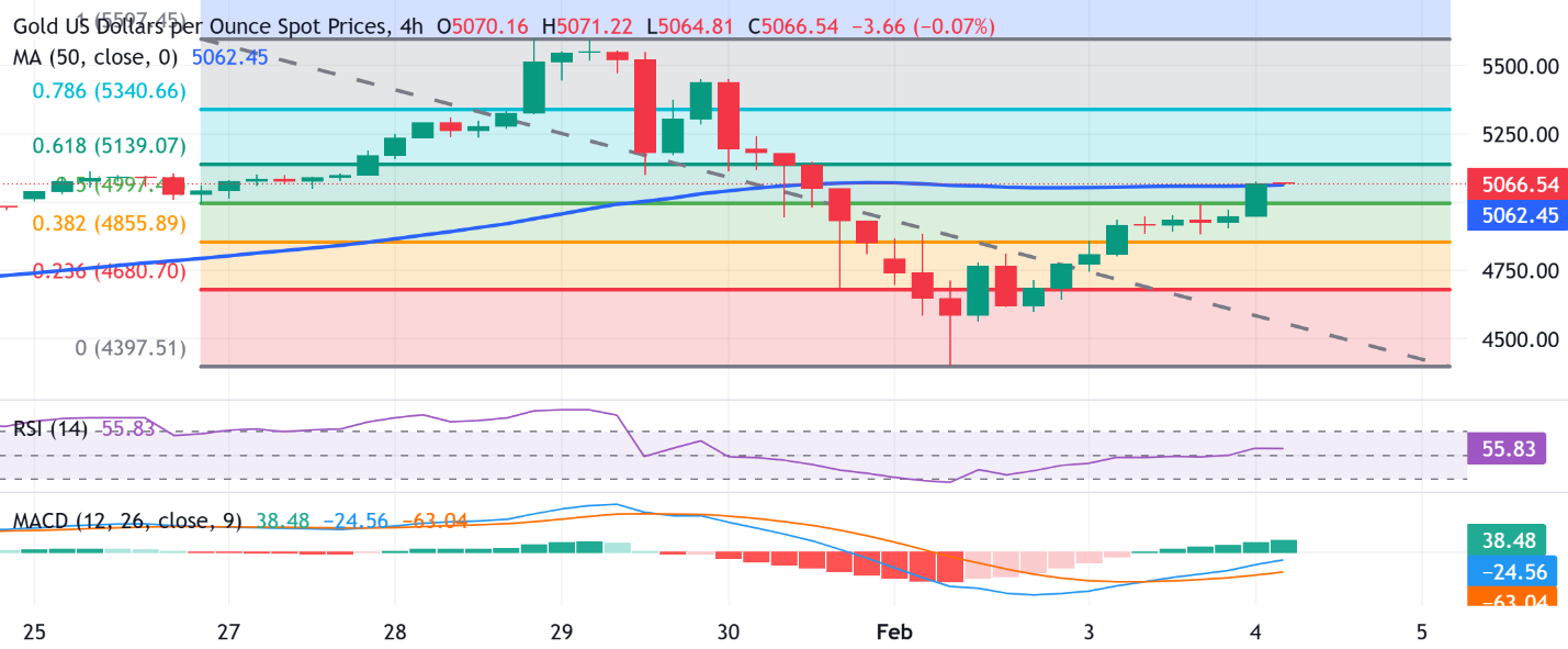 突破最近从$5,600附近,或从历史最高点的急剧调整的50%回撤位,可能被视为多头交易者的新的触发因素。一些超过50期简单移动平均线(SMA)的后续买盘将验证建设性的展望,并允许黄金价格进一步上涨。移动平均线收敛发散(MACD)线位于信号线上方并在正区域,带有扩大的正直方图,表明多头动力增强。相对强弱指数(RSI)显示55.83(中性),并且有所上升,反映出乐观的语气。