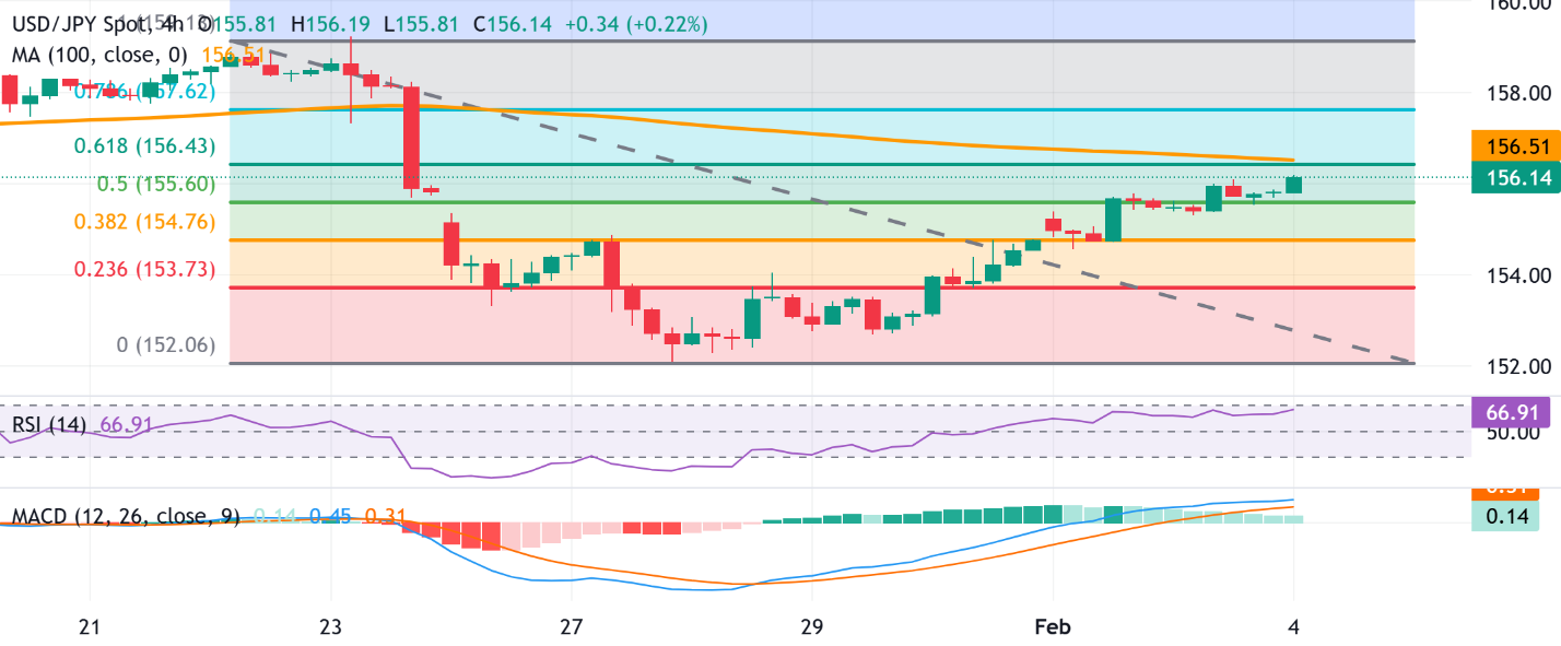 因此,任何后续的上涨更有可能在156.51交汇处遇到强劲的阻力——这包括4小时图上的100期简单移动平均线(SMA)和61.8%的斐波那契回撤位。需要突破上述障碍才能将短期趋势转向看涨。