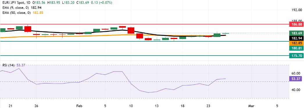 欧元/日元连续第二个交易日走强,在周三的亚洲时段交易于183.70附近。日线图的技术分析显示,14天相对强弱指数(RSI)为54,保持在中线以上并走高,表明有温和的看涨压力,如果买家重新控制市场,还有进一步上涨的空间。