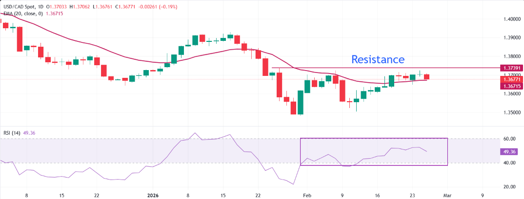 截至撰写时,USD/CAD 交易价格约为 1.3675,处于较低水平。该货币对在 20 日指数移动平均线 (EMA) 附近稳定在 1.3670 附近,保持价格走势与从 1.34 中期开始的更广泛的上升趋势一致。如果突破 1 月 27 日的高点 1.3740,价格可能会延伸至 1 月 23 日的高点 1.3800。