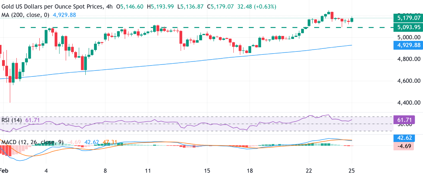 周三进入欧洲交易时段时,尽管黄金(XAU/USD)仍接近上一日触及的月度高点,但在5200美元的心理关卡之上难以找到支撑或进一步巩固。由于美国在中东集结军队,为周四第三轮美伊核谈判做准备,地缘政治风险依然存在。这成为重新激发对这种避险贵金属需求的关键因素。除此之外,一些美元卖盘的出现也为该商品提供了额外的支撑,推动了日内价格上涨。