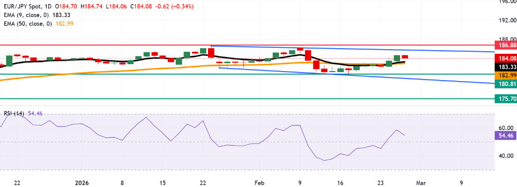 在连续两天上涨后,EUR/JPY周四欧洲时段交易于184.10附近,失去了一些涨幅。日线图的技术分析显示,由于该货币交叉在水平通道内整理,处于整理阶段。