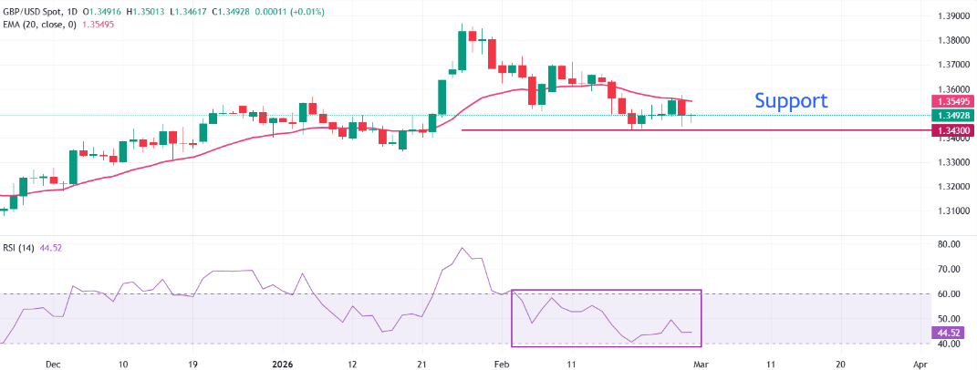 初步阻力出现在20日指数移动平均线(EMA)1.3550附近,若日收盘价高于这一障碍,则可重新打开通往1.3680区域和1.3830年1月高点的路径。在下方,立即支撑位位于2月19日低点1.3434,与近期低点一致,若突破该支撑位,将可能引发更深的回撤至1.3360区域。