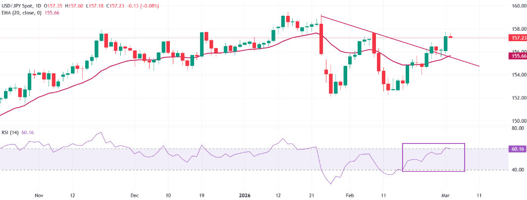 在日线图上,美元兑日元交易于157.23。短期趋势偏多,因为价格保持在接近155.70的20日指数移动平均线之上,表明从152.00区域的短期上涨趋势仍然有效。该货币对也交易在大约155.50突破的下降阻力线之上,将该突破区域变成支持上涨的技术支撑点。RSI接近60确认了积极的动量,没有超买的情况,表明买家仍然控制着市场,而上涨压力保持有序。