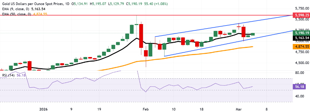 黄金价格(XAU/USD)在写作时约为5,190美元。日线图的技术分析表明,由于金属价格保持在上升通道模式内,存在看涨倾向。