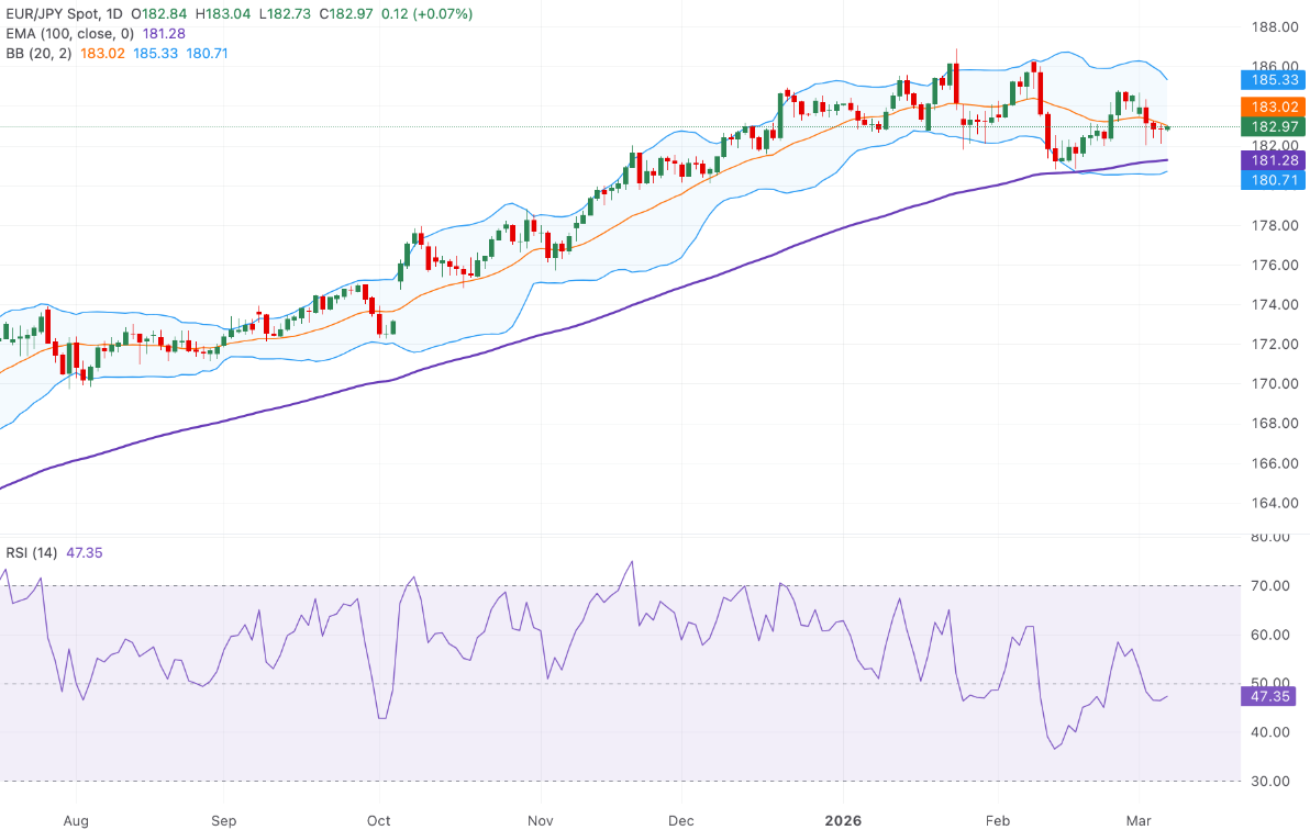 初始阻力出现在2月26日的184.74,高于布林带上轨的185.30,如果日收盘价高于此位置,将确认向186.30区域的延续。下方来看,即时支撑位是3月5日的低点182.11。在此之下,100日EMA附近的181.30是一个关键的结构性支撑位,需要保持以防止向180.70进行更深的回撤。只要价格交易在这个EMA群之上,回撤将被视为仍在每日上涨趋势中的修正。