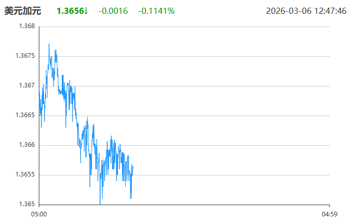 截至2026年3月6日 ,美元兑加元报1.3658,跌0.1024%,日内波动1.3655-1.3679,维持震荡偏强格局。此前受美元强势、油价波动及加央行政策偏鸽支撑,汇率一度逼近1.37关口,短期受美国非农偏弱信号拖累小幅回调,整体仍处于近期震荡区间。