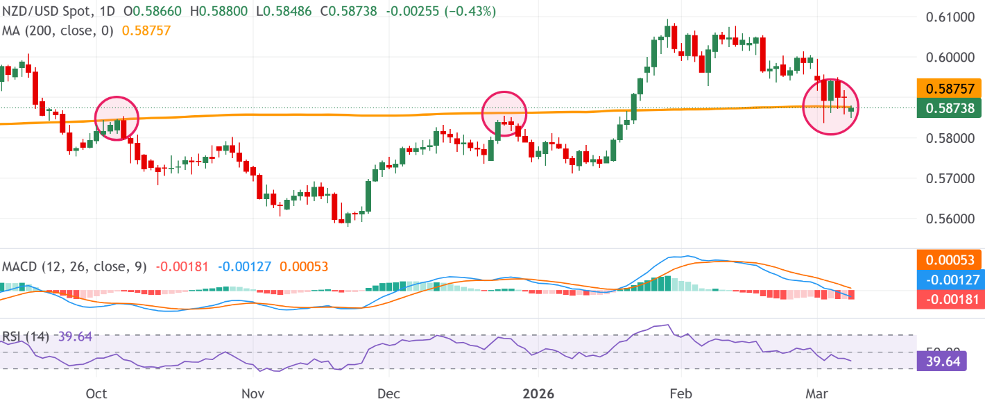从技术角度而言,由于纽元兑美元汇率进一步下跌至200天简单移动平均线(SMA)下方,接近0.5876,暴露了中长期支撑的丧失,近期 bias 趋势偏空。此外,移动平均线收敛发散(MACD)线保持在信号线下方,并且在零线下方扩展,负面柱状图的扩展强化了当前的下跌动力。更进一步,相对强弱指数(RSI)保持在39.6,低于50的水平,表明空方压力在增加,而不是超卖阶段已经结束。