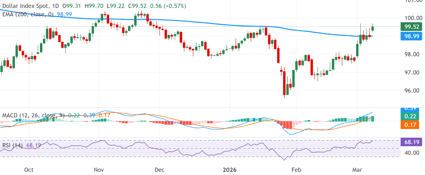 从技术角度而言,由于美元指数突破了接近99.00的200日指数移动平均线(EMA),偏多的短期情绪有所增强,这表明更广泛的上涨趋势正在恢复。此外,移动平均线收敛背离指标(MACD)也处于正值区域,MACD线位于其信号线上方,并且柱状图呈温和正值,这表明上方动力在增强。