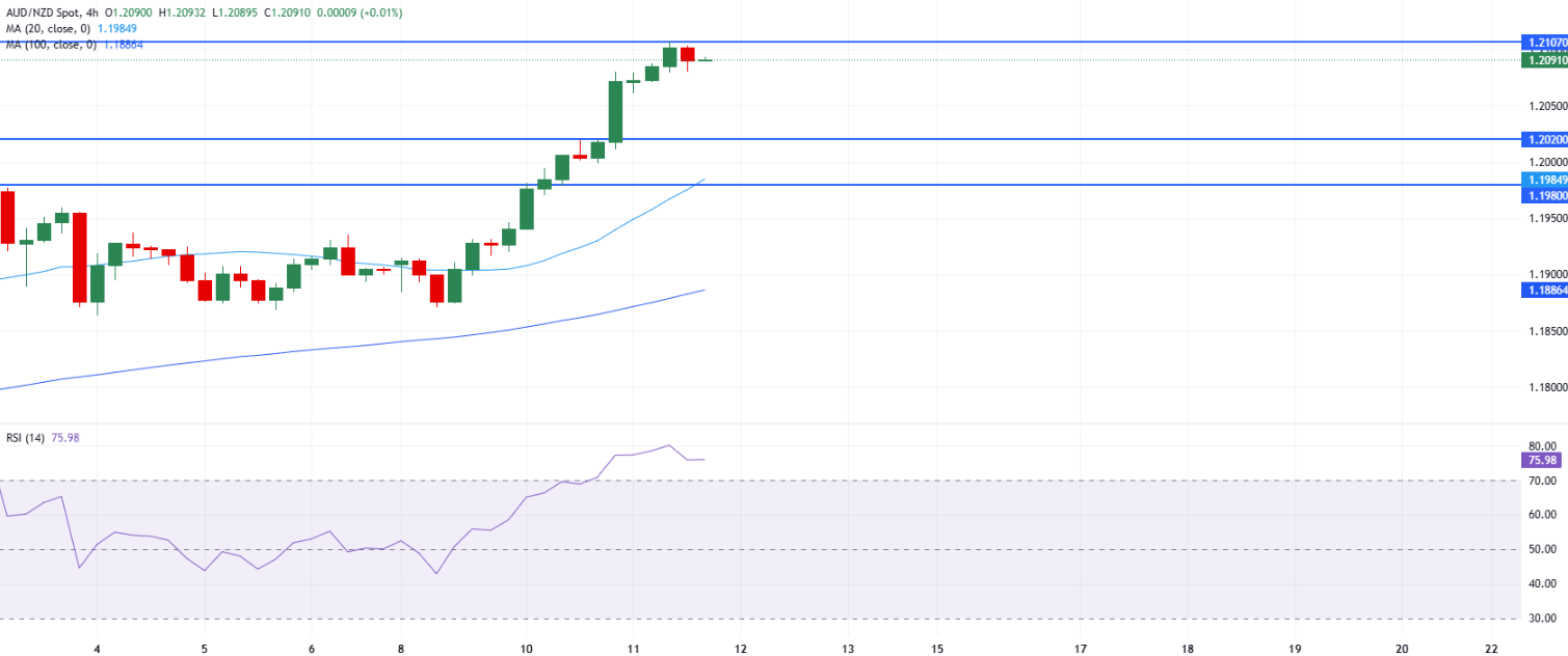 在4小时图上,AUD/NZD交易于1.2091。由于价格保持在上升的20期和100期简单移动平均线(SMAs)之上,短期趋势偏多。这两个移动平均线表明在此时间框架上的趋势结构正在改善。短期移动平均线已转为上升,并与长期移动平均线背离,显示出强劲的上涨动力。相对强弱指数(RSI)指标保持在70以上的超买区域,从之前的峰值有所撤退。